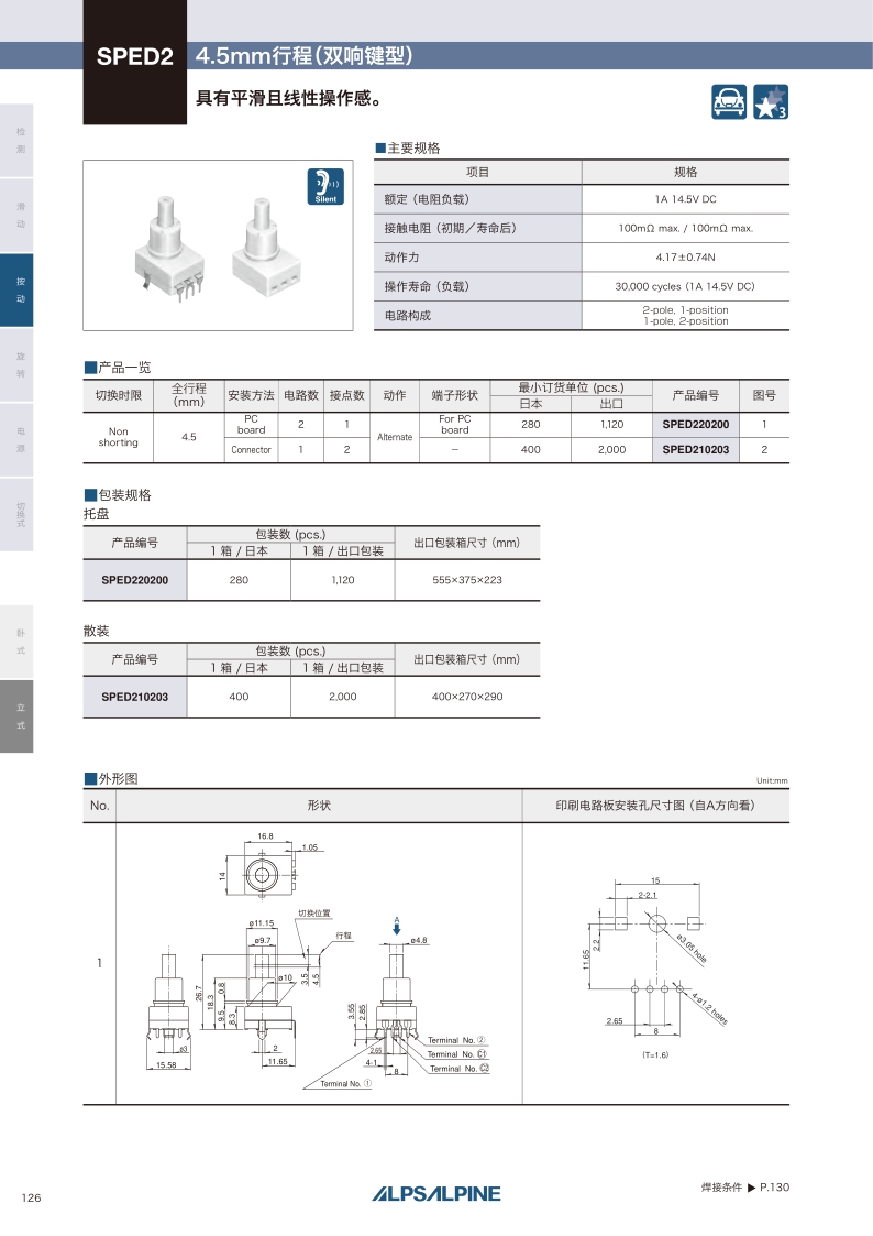 SPED220200 照片 Non shorting 4.5mm 4.17±0.74N PC board 2 1 Alternate For PC board 16.8×14.0×9.5mm